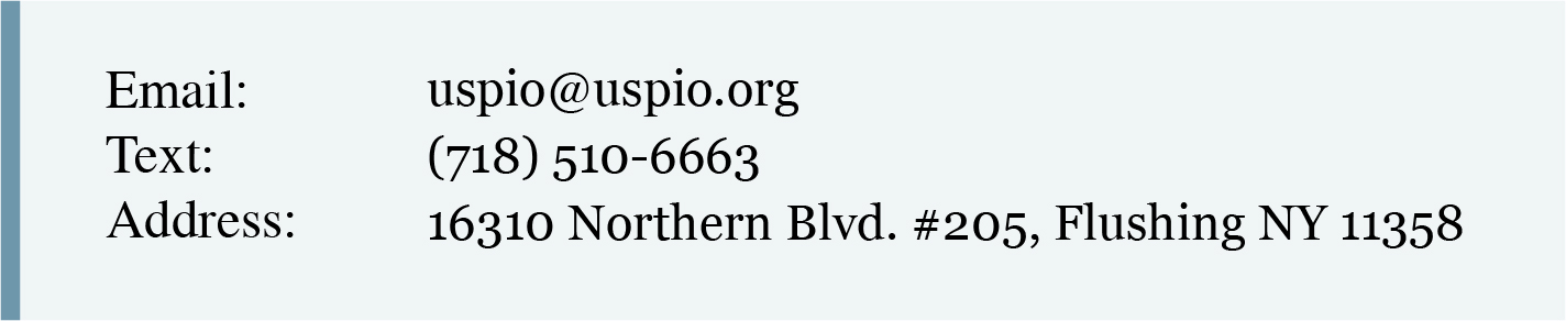 A All incoming contacts are screened and responded to within 24 hours. The USPIO prefers to communicate via email so that records can be kept. If you need an immediate response, text us. All texts are forwarded to the responsible party.
